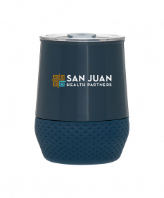 12 oz double wall 18/8 stainless steel thermal tumbler with copper vacuum insulation, push-on lid, matching swivel closure, and removable silicone base.