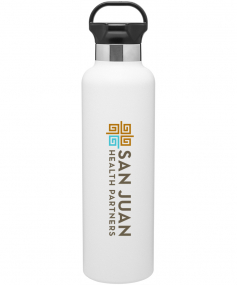 24 oz powder coated double wall 18/8 stainless steel thermal bottle with copper vacuum insulation, threaded gear-shaped insulated lid and carrying handle Complies with FDA, Prop 65. 11.25" H x 3" W