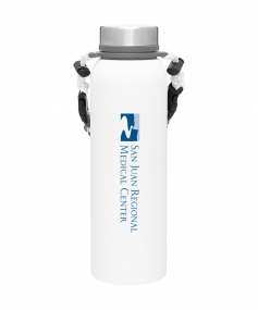 32 oz double wall 18/8 stainless steel thermal bottle with copper vacuum insulation, insulated stainless steel threaded lid, silicone ring, removable strap with buckles, removable clasps, and powder coated finish. Individual gift box. Hand wash recommended. Do not microwave. Complies with FDA, Prop 65. 11" H x 3.1875" W