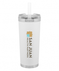 24 oz double wall 18/8 stainless steel thermal tumbler with copper vacuum insulation, stainless steel rim and base, threaded Eastman Tritan lid, snap closure, straw opening, and flexible wide silicone straw.
