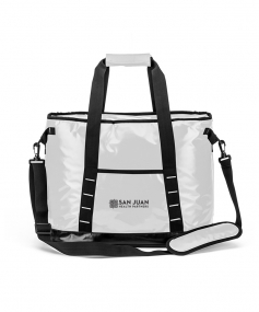 40C Tarpulin water resistant cooler bag. Gray PEVA insulated lining; detachable and adjustable padded shoulder strap; hook and loop wrap handle and side grab handles; piping accents. 10" D x 13 3/4" H x 18" W.